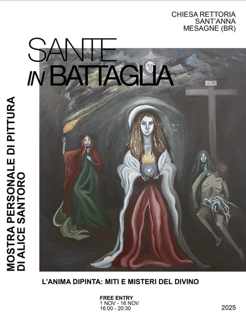 L’associazione turistica e culturale Pro Loco di Mesagne a.p.s. organizza per sabato 1 novembre, presso la Chiesa Rettoria Sant’Anna di Mesagne, l’inaugurazione della personale di pittura della pittrice Alice Santoro, dal titolo Sante in battaglia. La mostra sarà visitabile presso la suddetta Chiesa tutti i giorni dalle 16.00 alle 20.30, fino al 16 novembre p.v.